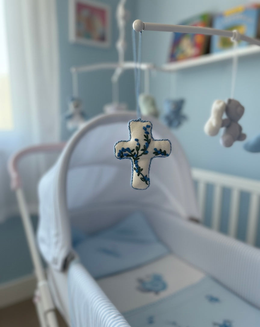 Cruces bordadas a mano, totalmente personalizables con nombre, fecha de nacimiento… para moisés, carritos de paseo, cunas, etc.